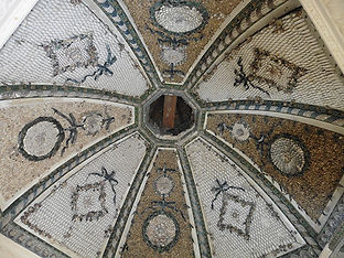 C1750. Grade 1* status shows the rarity of this thatched Shell House. Set in a walled garden it was part of a Merchant’s House in the centre of Sherborne. Owned by Samuel Foot (1704-92). We do not know the shell artists. The octagonal interior is unusually intact and decorated with classical shell floral patterns that incorporate repeat swags. The ceiling’s 8 panels use hand decorated shells mainly sourced from the Dorset coast.